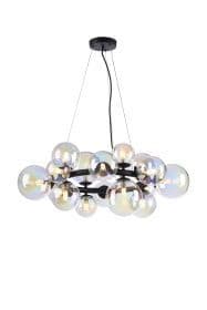 Fun and bubbly 16 light circular fitting in satin black with iridescent glass shades. Height adjustable at time of installation.